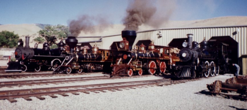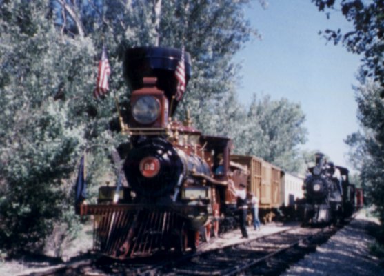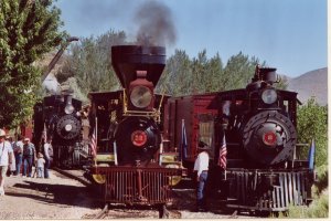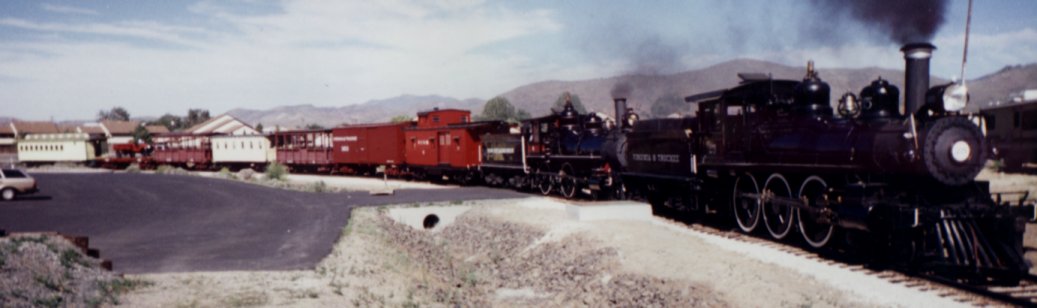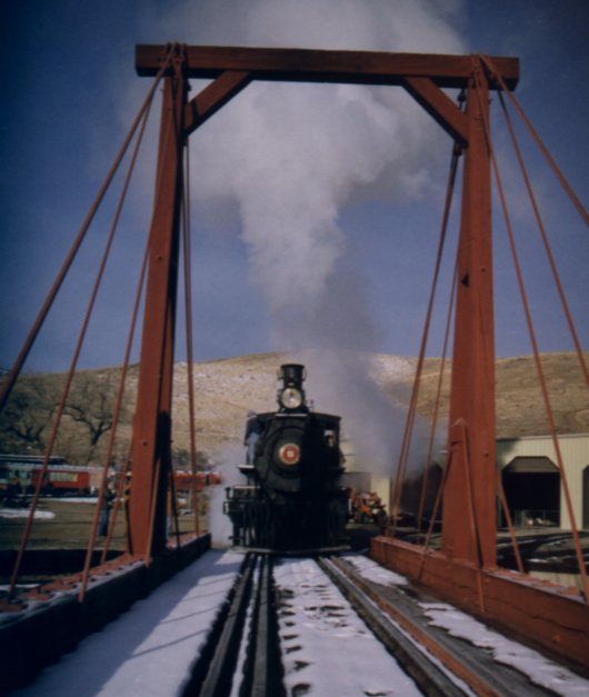 Virginia & Truckee No. 25 during the 1997 V&T Symposium was the star of the weekend. Pictured here crossing the museum access road. This "Ten Wheeler" caused many to Stop, Look and Listen! |